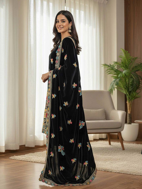 • Black Embroidery Coding Sequence Work Velvet Suit Set With Dupatta
