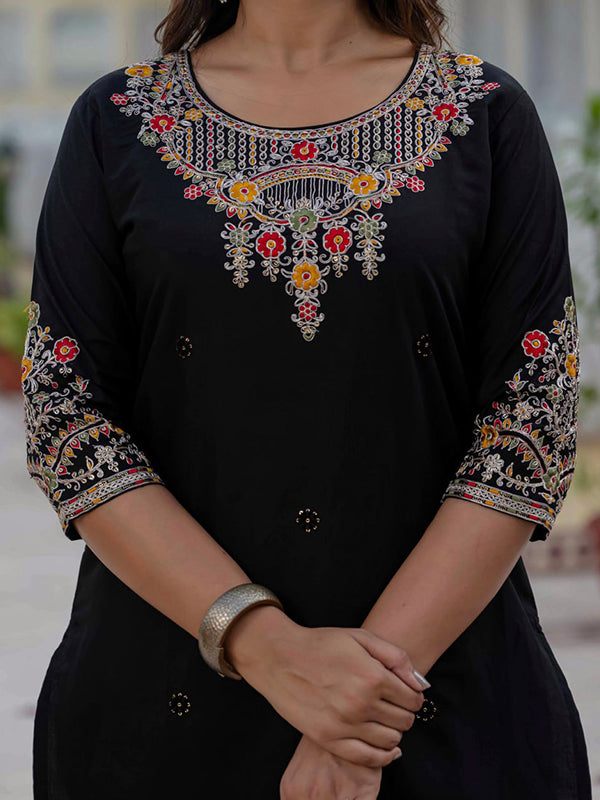 Black Embroidery Sequins Work Roman Silk Kurti Pant & Dupatta Set