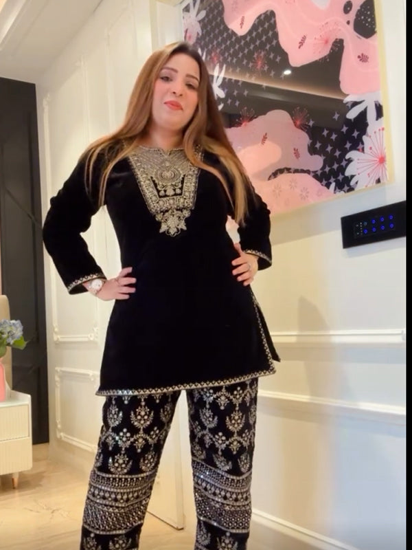 Buy Black Velvet Sequence Embroidery Work Suit Pant With Dupatta Online. This Suit Is A Must Have In Every Woman's Wardrobe.