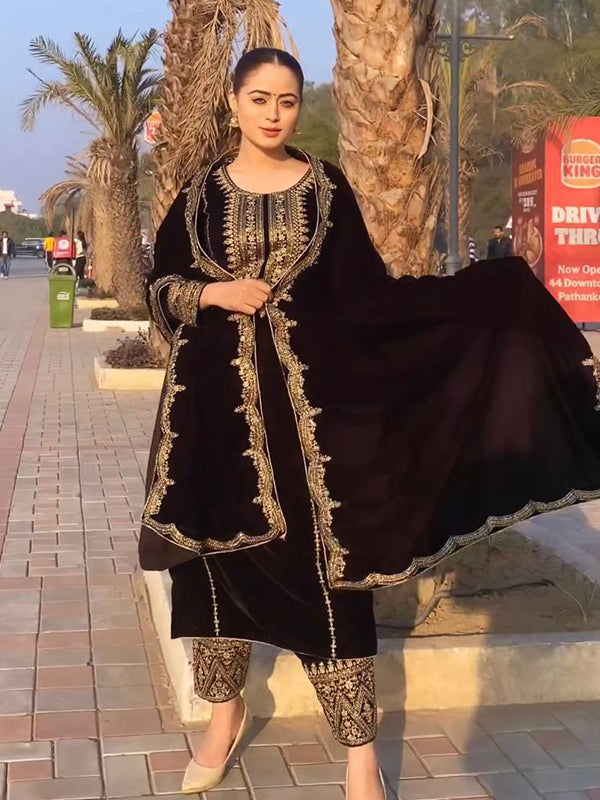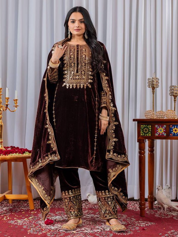 • Brown Embroidery Sequence Work Viscose Velvet Kurti Plazzo With Dupatta