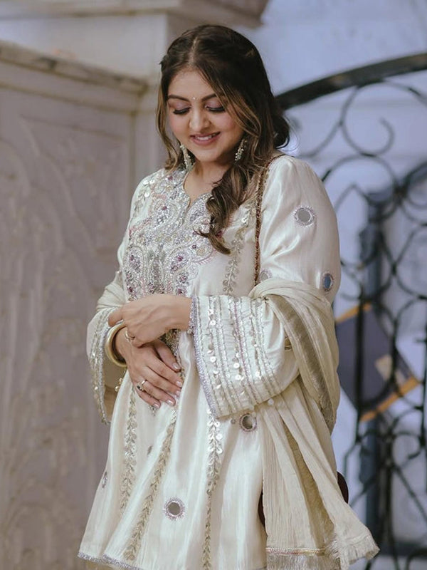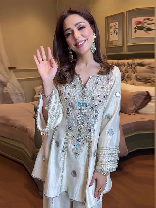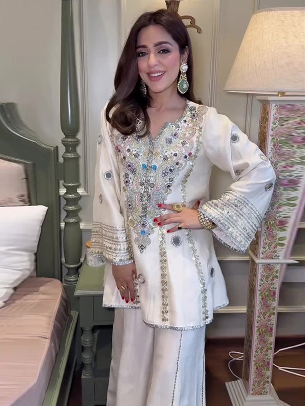 Buy Ivory Luxe Hand-Embellished Kurta & Palazzo Set intricate hand-embroidered mirrorwork and bead embellishments, giving it a festive yet elegant look. Statement cuffs feature layered mirror detailing for a glamorous finish, while the matching pants complete the ensemble with effortless style. Perfect for festive gatherings, weddings, or evening celebrations.