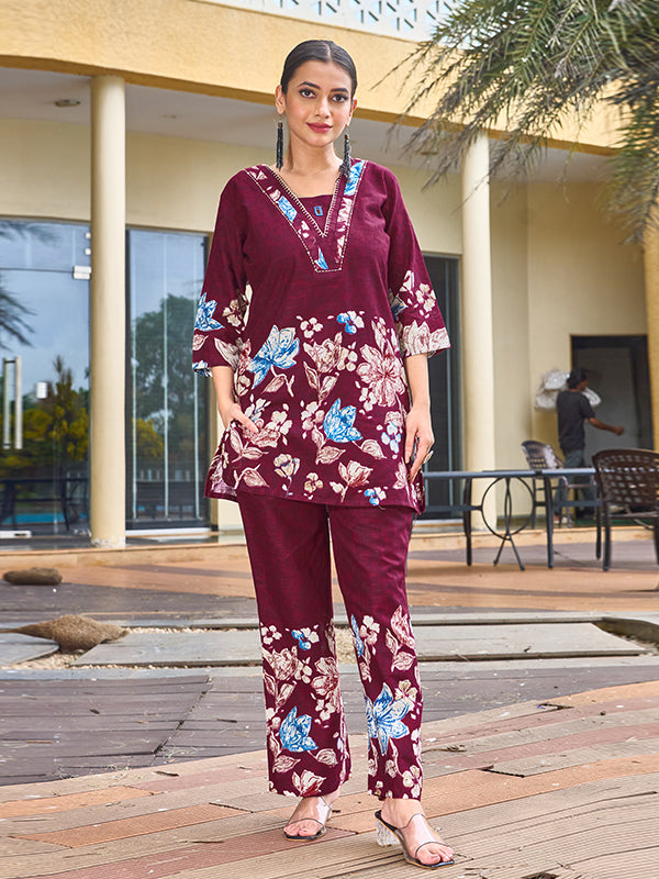Maroon Pure Cotton V Neck A-line Top With Printed Pant