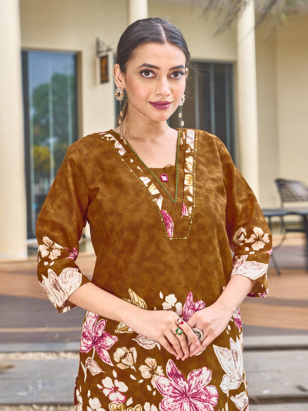 Buy Mustard Yellow Pure Cotton V Neck A-line Top With Printed Pant Online. This Kurti Is A Must Have In Every Woman's Wardrobe.