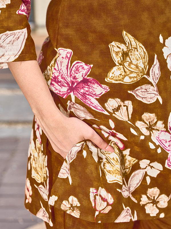 • Mustard Yellow Pure Cotton V Neck A-line Top With Printed Pant