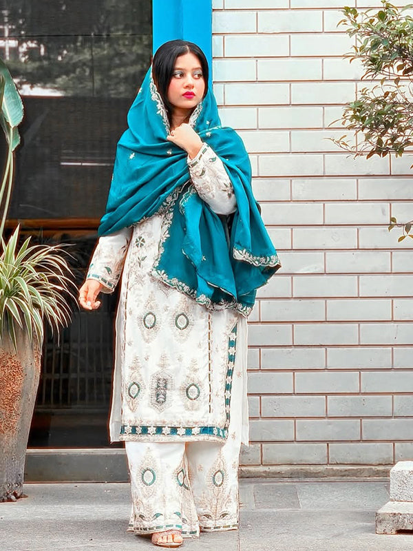 • Off White Embroidery Sequence Work Chinon Silk Plazzo Suit With Sky Blue Dupatta