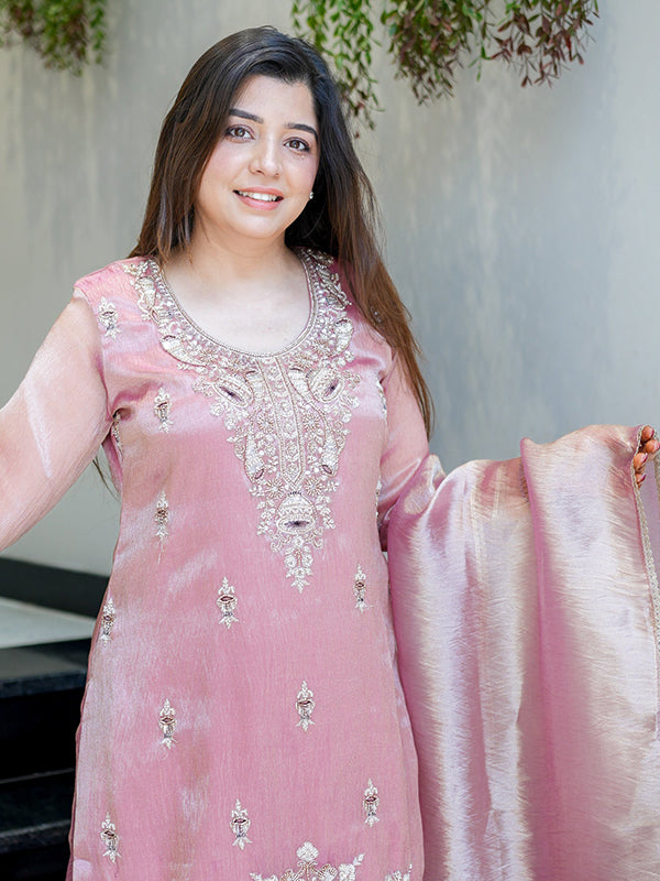 Rose Gold Embroidery Sequence Work Jimmy Choo Silk Plazzo Suit Set – Niharika Jaipur