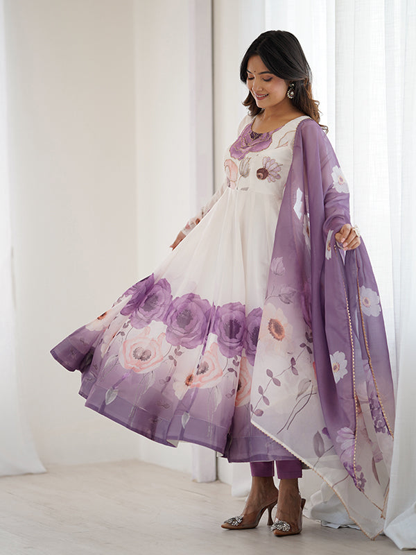 Violet Pink Floral Printed Anarkali Gown With Pant & Dupatta Set Violet Pink Floral Printed Anarkali Gown With Pant & Dupatta Set