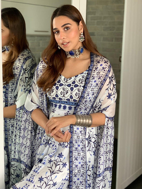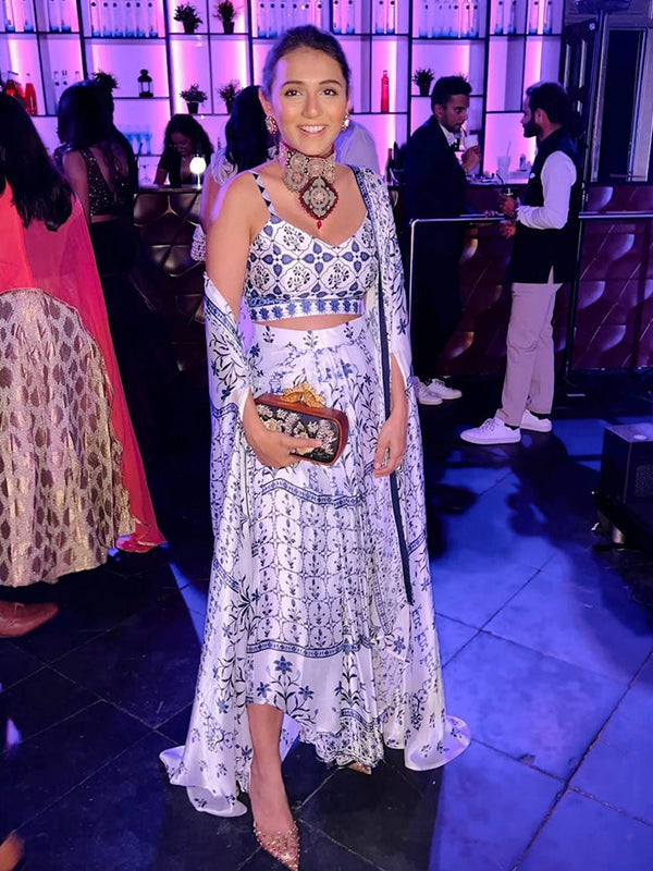 White Satin Georgette Moroccan Print Dhoti Skirt Set – Niharika Jaipur