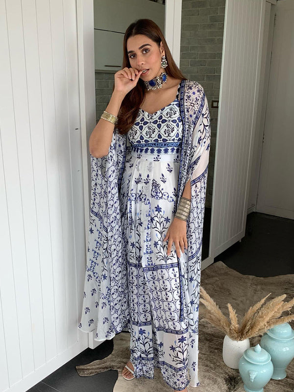 White Satin Georgette Moroccan Print Dhoti Skirt Set